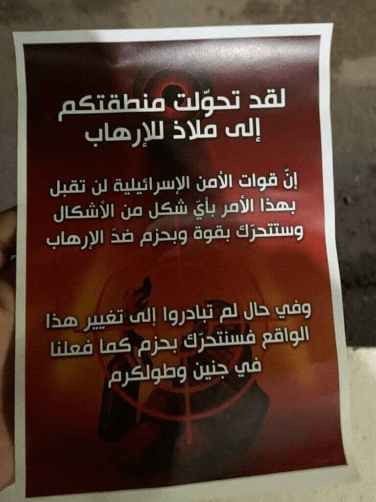 « Votre région est devenue un refuge pour le terrorisme. Les forces de sécurité israéliennes n’accepteront en aucun cas cette situation et agiront avec force et détermination contre le terrorisme.