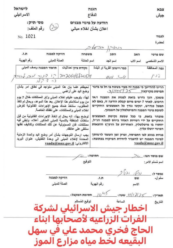 Le 4 décembre, les forces d’occupation ont émis de nouveaux ordres de démolition à l’encontre de la société agricole Al-Furat, qui appartient aux fils de feu Hajj Fakhri Muhammad Ali dans la plaine de Baqi’a.