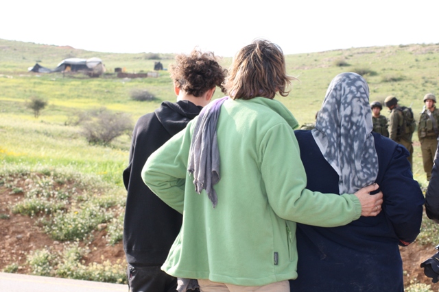 Friday 25th- We were all up well before 6am, expecting the worst. Nabeel had made it clear that he would not leave the land voluntarily – doing so would be giving away his right to earn a living and support his family. All seemed quiet until we saw a series of army jeeps going up the opposite hill to Maskiyyot settlement (where it seemed the settlers who were harrasing the family came from), whilst others stopped on the road below, joined by the Israeli police. We can only guess at the discussions that went on between the soldiers and the settlers in maskiyyot, but the jeeps then came down the hill in convoy and straight up to Nabeel and Ghada’s home.