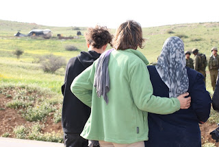 They forced all the internationals and photographers away from the house before they allowed Ghada and the children to leave. With nowhere left to go the family gathered on the grass at the bottom of the hill, with those there to support them, and people brought food to share. Not content with this the army came again, making an ad hoc declaration of a closed military area, and forcing everyone to leave the green hillside and sit on the gravel on the opposite side of the road.