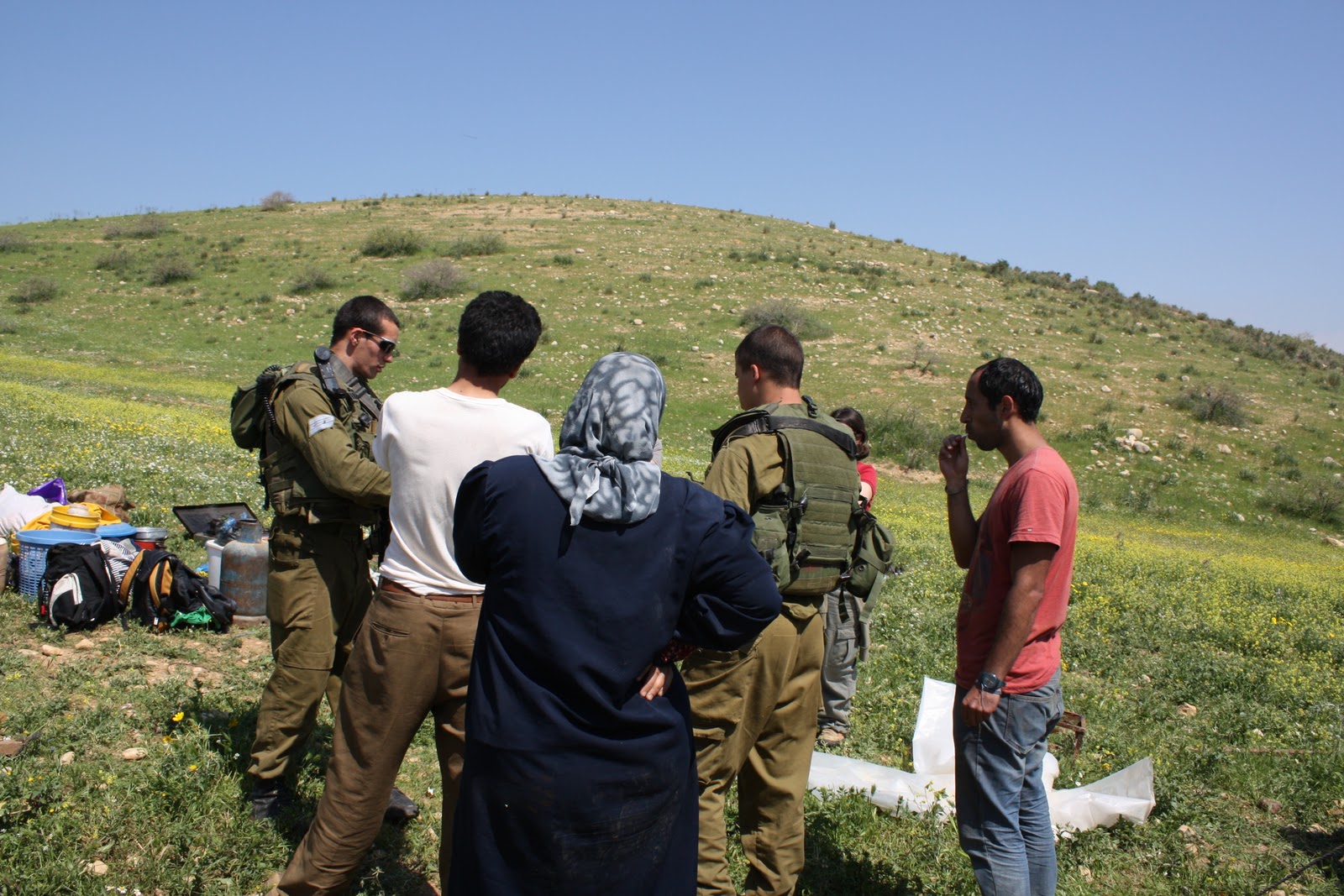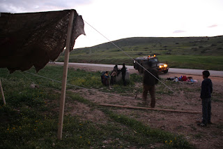 As the main structure of tent went up, we were gathered underneath to clear the land, following the lead from the family, and started to relax , chat and drink tea as we worked. Then we saw the army jeeps stopping across on the road. They came to the family, demanded Nabeel’s ID yet again, and said that the family would have to leave in 10 minutes.